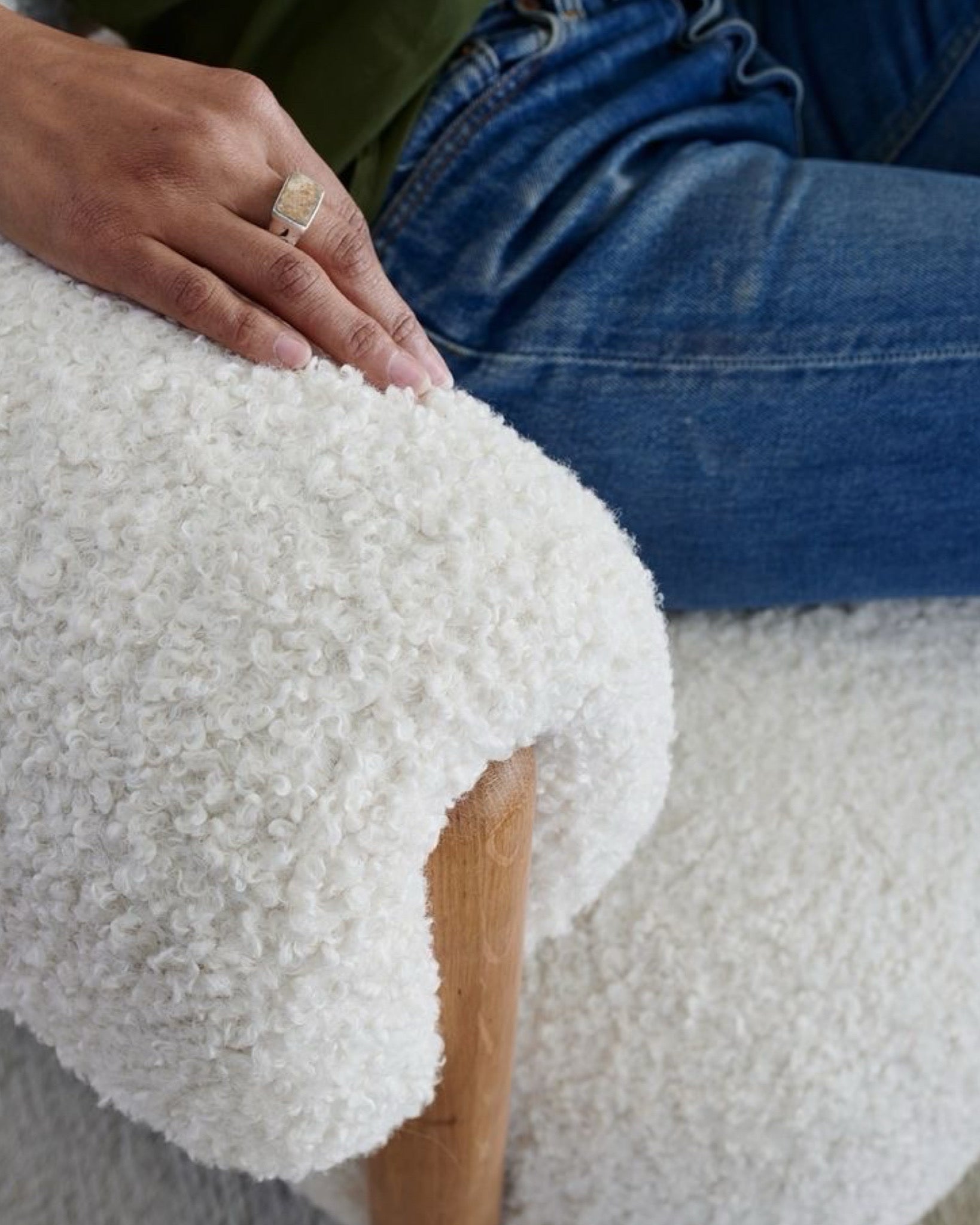 With the Elara Lounge Chair, we are introducing two new materials to our palette: a stone-colored boucle that mixes creams, browns, and greys for depth or an upholstery that is sheepskin-reminiscent with curled texture.